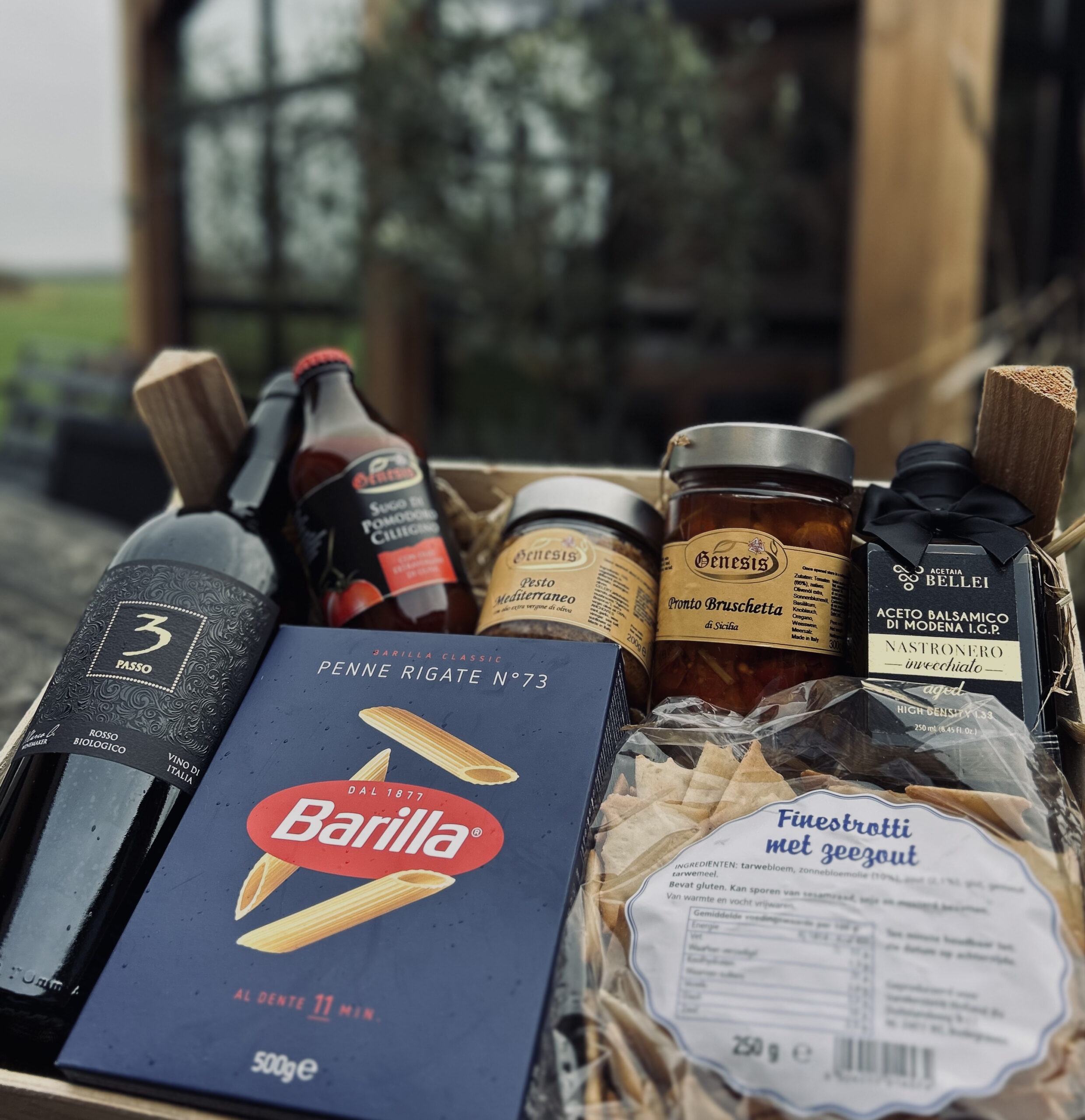 Onze cadeau pakketten bieden een smaakvolle reis door Italië: van ambachtelijke pasta’s en pure tomaten creme tot verfijnde olijfolie, traditionele antipasta en verrukkelijke zoetigheden. Combineer dit met een zorgvuldig geselecteerde fles wijn, en u heeft een geschenk dat gegarandeerd in de smaak valt.